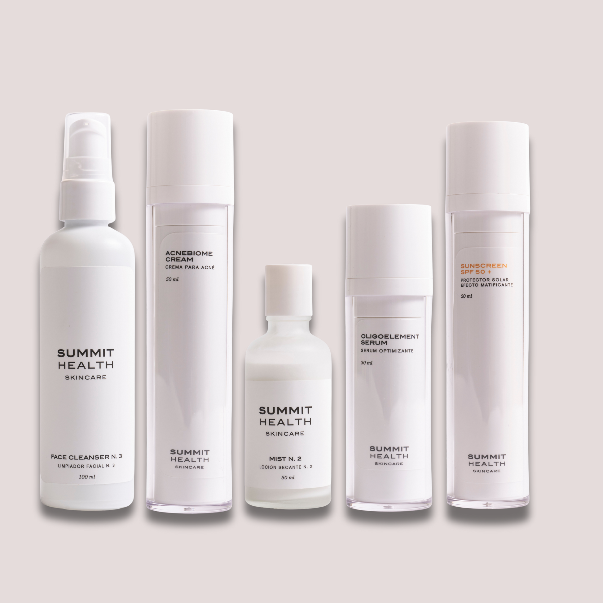 El kit para acné, incluye: Face cleanser N.3, Acnebiome Cream, Mist 2, Oligoelement Serum + Regalo sunscreen.